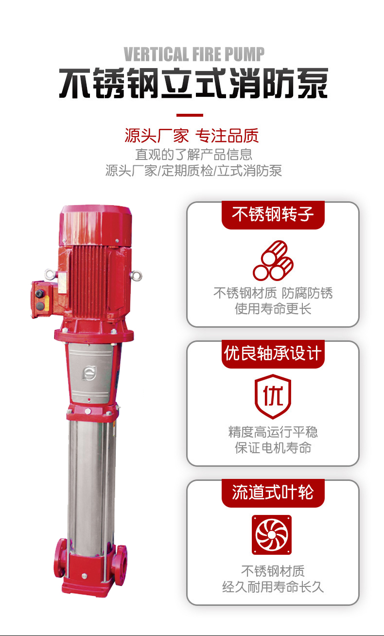 南方XBD-DL非自吸立式多級消防泵組,電機(jī)軸通過聯(lián)軸器直接與泵軸聯(lián)接,葉輪導(dǎo)葉采用鑄鐵件,泵進(jìn)出水口位于泵底同一直線上。