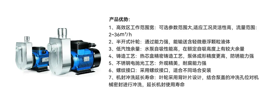 NZXF系列小型不銹鋼自吸泵是在硏究國內外同類產品的基礎上,結合我司先進優秀的水力模型開發的一種結構新穎、性能卓越的產品。該泵與目前市面同類產品相比具有自吸性能好,有一定排污能力,結構簡單緊湊,外觀小巧精美,特殊結構能保證機械密封的可靠性和延長其運行壽命,各項性能指標在國家實驗室測試合格,在國內處于領先狀態,在家用、工農 業具有廣泛前景。